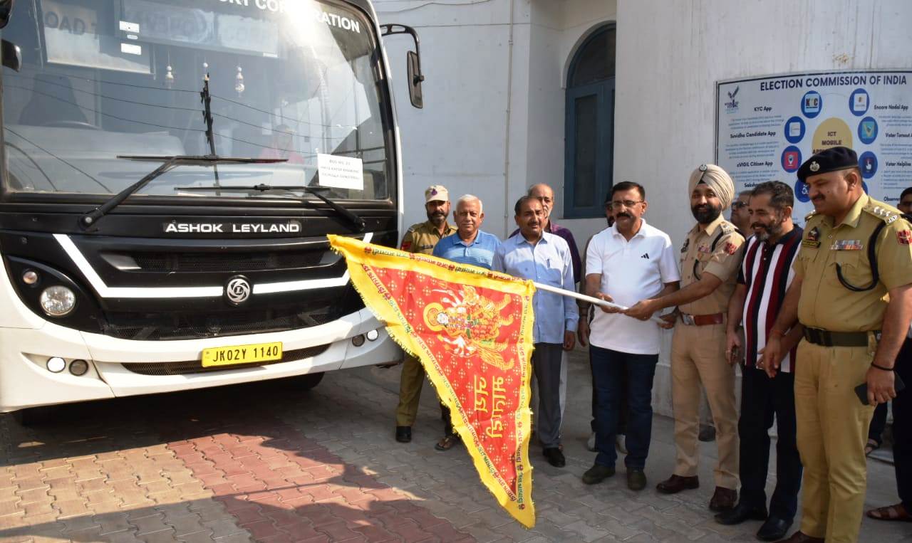 UDHAMPUR, JUNE 12: Additional Deputy Commissioner Udhampur, Joginder Singh Jasrotia, today flagged off a batch of 66 pilgrims for the Kheer Bhawani Yatra 2024 to the Kashmir Valley. The event took place at the DC Office Complex in Udhampur.