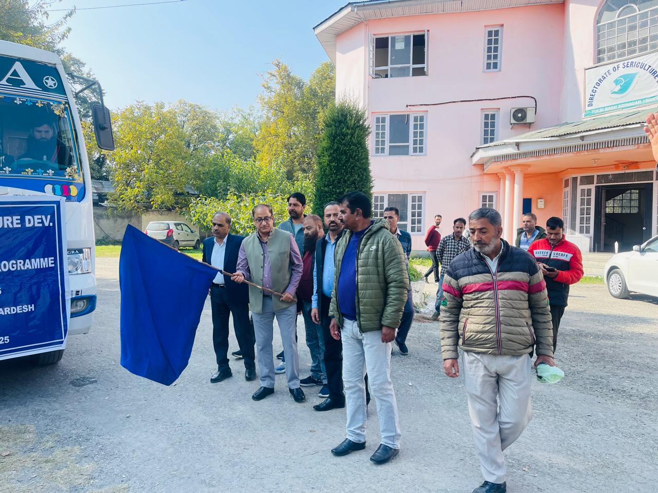 SRINGAR, OCTOBER 13: As part of the ongoing Skill Development Programme of the Sericulture Development Department, Director Sericulture J&K, Ajaz Ahmad Bhat, today flagged off a group of Silkworm Rearers for four-day Inter-State Farmers Training Programme to Himachal Pradesh under the Centrally Sponsored Scheme – ATMA (2025-26).