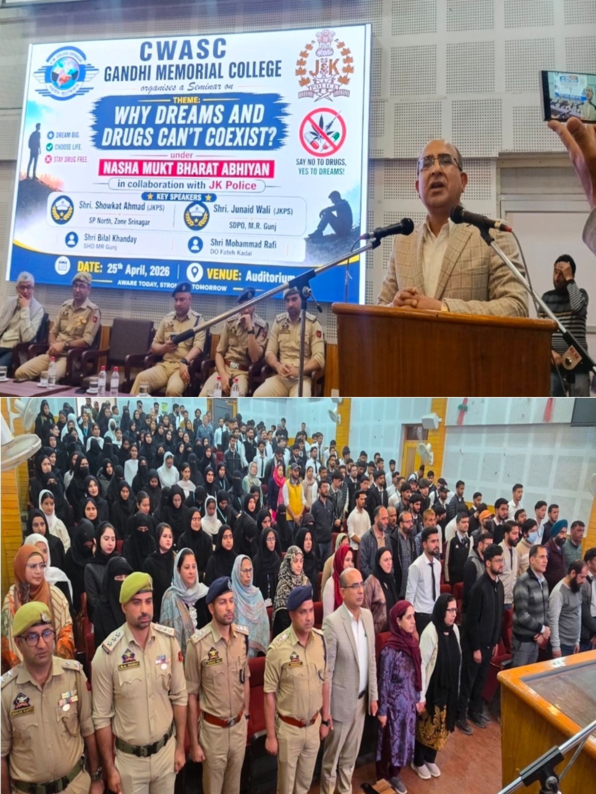 SRINAGAR, APRIL 25: Centre for Women and Social Concerns (CWASC), Gandhi Memorial College, Srinagar today organized a seminar titled “Why Dreams and Drugs Can’t Coexist” under the aegis of the Nasha Mukt Bharat Abhiyan in the college auditorium.