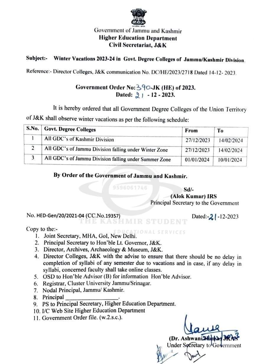 According to the news agency—Kashmir News Observer (KNO) Principal Secretary, Higher Education Department, Alok Kumar said that government Degree Colleges of Kashmir region shall observe the vacations from December-27-2023 to February-14-2024.