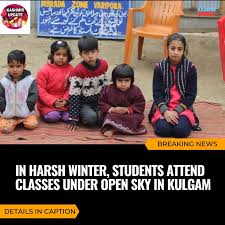 Kulgam (Yaripora), Dec 04 : In the harsh winter conditions, the students enrolled in a Government Primary School in Bebrada area of Yaripora belt in south Kashmir’s Kulgam district, are attending their classes under open sky in absence of the proper building.