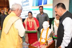 SRINAGAR, OCTOBER 02: Lieutenant Governor, Shri Manoj Sinha today paid tributes to Pujya Mahatma Gandhi on his Janm-Jayanti. The Lieutenant Governor said the ideals of Bapu are a source of inspiration for the entire humanity and it is the collective responsibility of the society to inculcate the values of non-violence, truth, tolerance and compassion in the young generation.