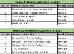 In the category of Associated Hospitals of Govt. Medical Colleges the first rank has been clinched by Jammu Psychiatric Disease Hospital, followed by Chest Disease Hospital Jammu, Govt. Lal Ded Hospital, Srinagar, GMC Rajouri and SMGS Hospital, Jammu. Bottom five in this category includes Govt. Dental College, Jammu, Srinagar Psychiatric Disease Hospital, Govt. Dental College, Srinagar, GMC Handwara and Jammu Super speciality Hospital.