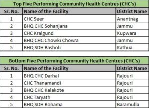 In the category of Community Health Centres (CHCs), first rank has been clinched by CHC Seer followed by CHC Sohanjana, CHC Kralgund , CHC Chowki Chowra and CHC Basholi. Bottom five in this category includes CHC Darhal, CHC Thanamandi, CHC Kalakote, CHC Taryath, & CHC Rohama.