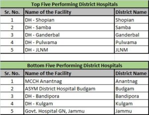 In the category of District Hospitals first rank has been clinched by DH Budgam followed by DH Shopian, DH Samba, DH Ganderbal, DH Pulwama, DH JLNM, Srinagar. Bottom five in this category include MCCH Anantnag , DH Budgam, DH Bandipora, DH Kulgam and Govt Hospital, GandhiNagar, Jammu.