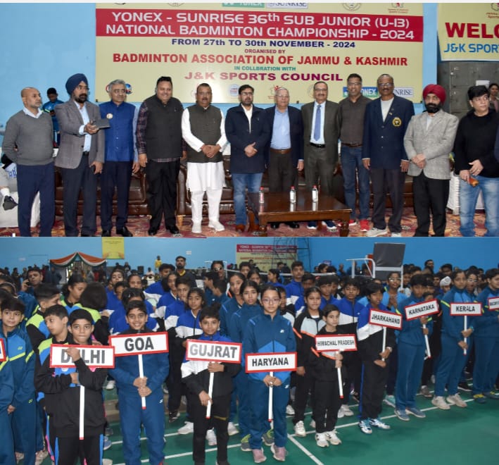 JAMMU, NOVEMBER 27: Minister for Youth Services & Sports, Science & Technology, FCS&CA, Transport, IT, ARI & Training, Satish Sharma, today declared open the “Yonex- Sunrise 36th Sub Junior (U-13) National Badminton Championship-2024” at the Indoor Sports Complex, M A stadium in Jammu.